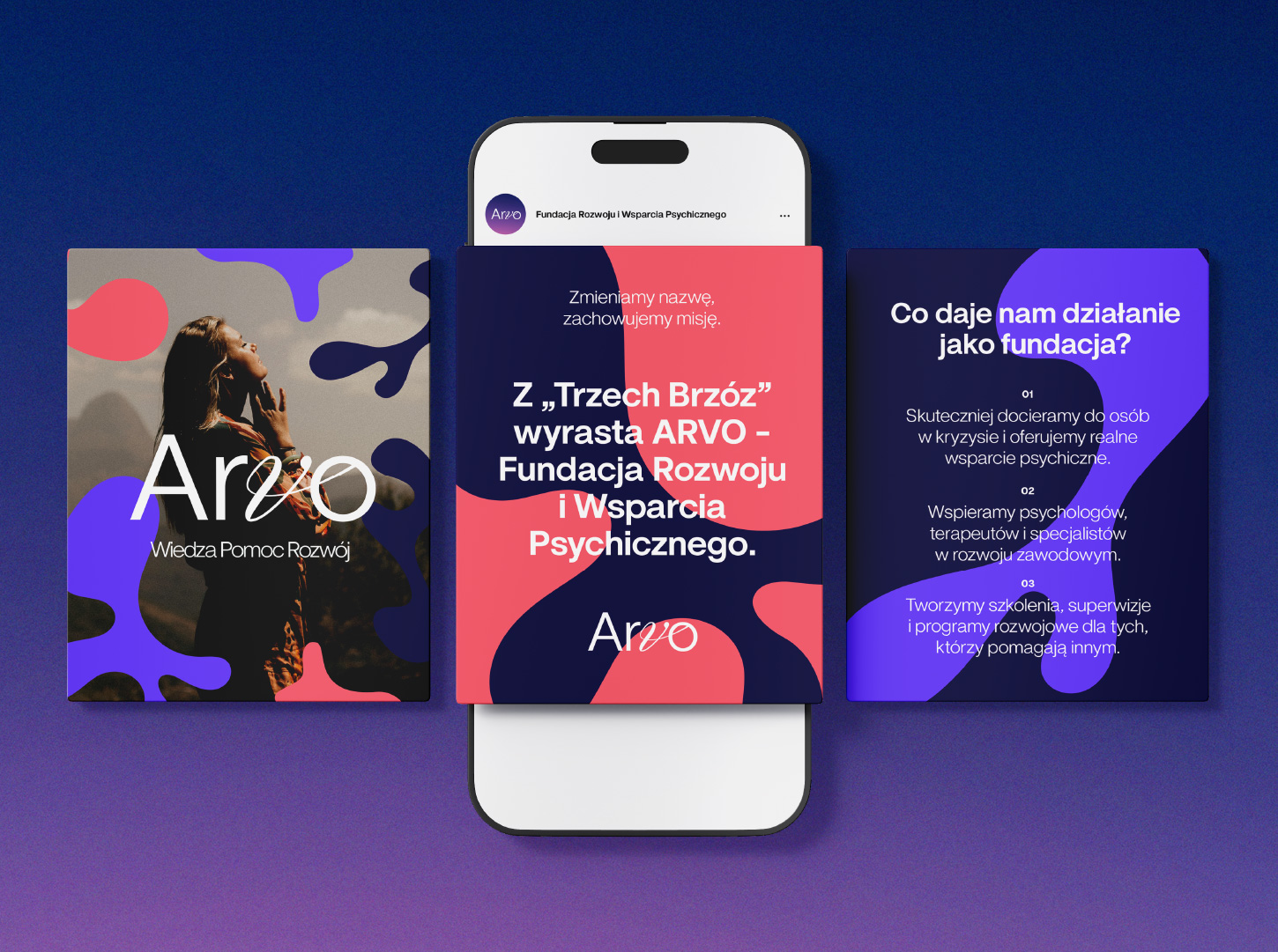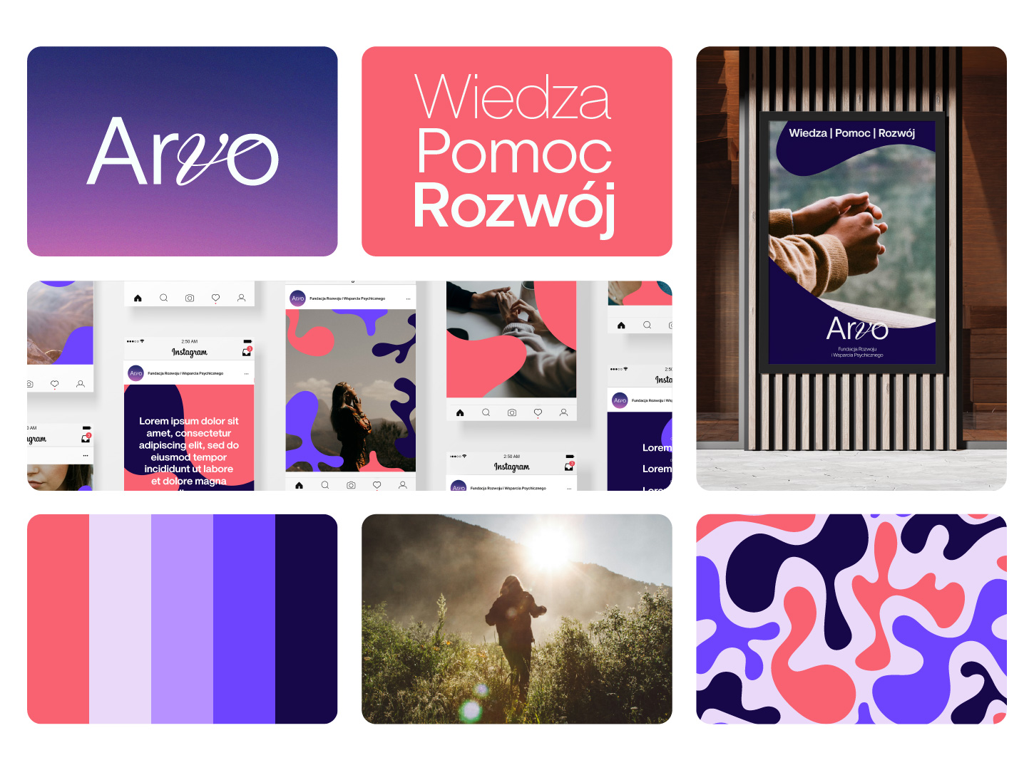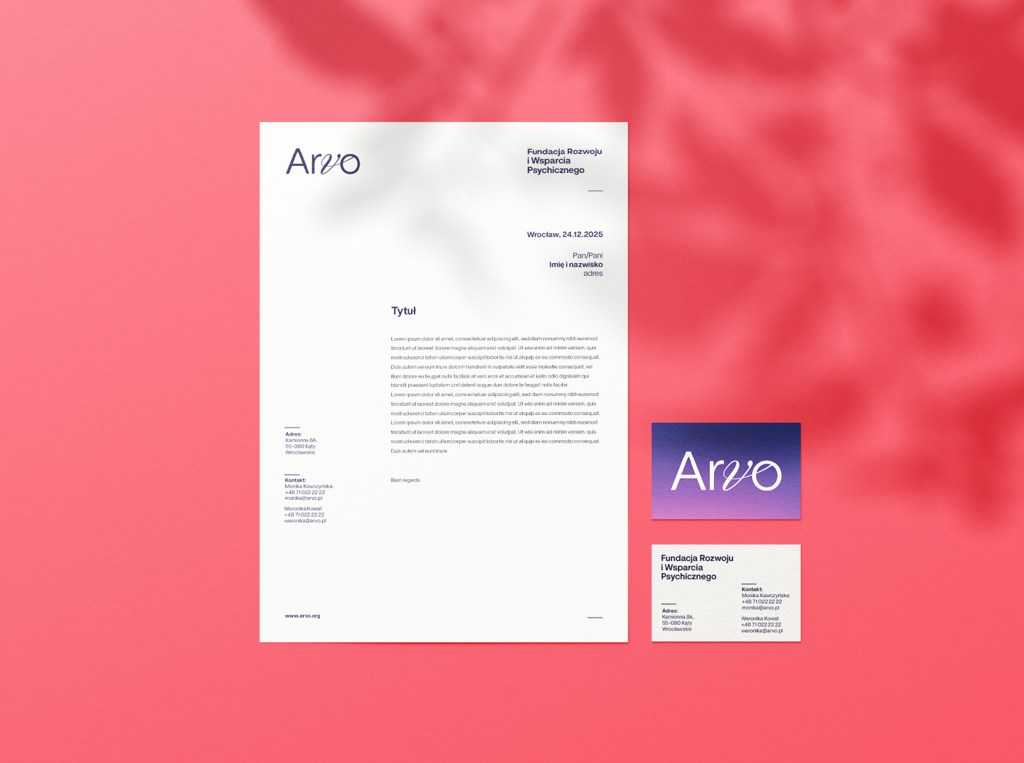 Visual identity for Arvo – a foundation focused on prevention and support in mental-health crises. The brief called for a typographic, modern logotype that avoids hugging symbols and refers to the origin of the name itself. In Finnish, „arvo” means “value” – a concept that is ethically strong yet emotionally neutral. The colours were meant to feel uplifting, avoid pastels, and stand out among similar identities.